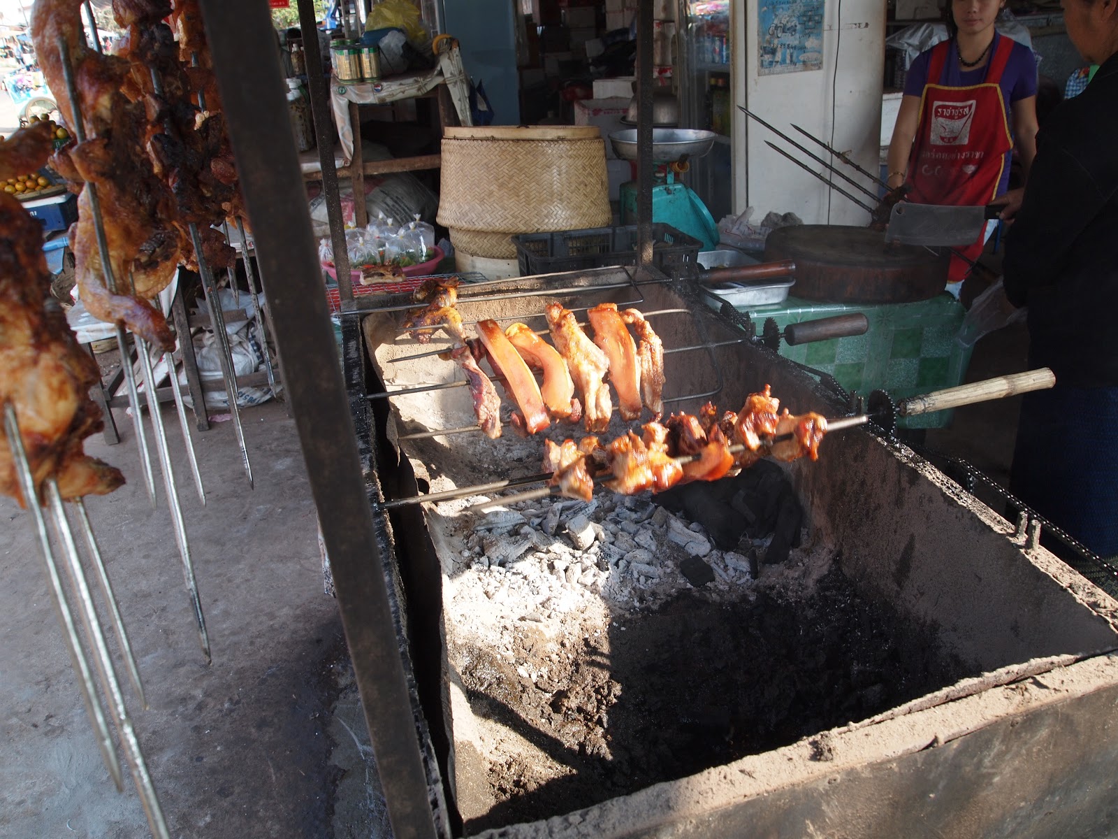 Along the Highway 2, you can find lots of street stalls selling grilled meat / chicken and Thai sausages, to be eaten with sticky rice.. Sticky rice is very popular among the Issan people..